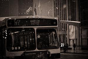 This is a image of bus traveling through Manhattan to Harlem New York. This image was taken by PROLYPHIQ. (Sean West)