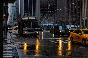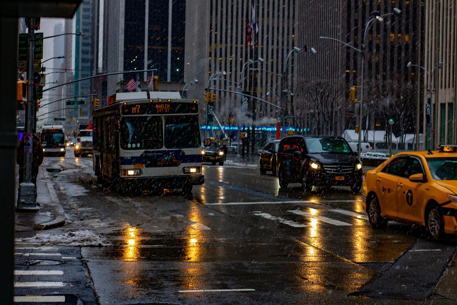 This is a photo of a bus on a cold snowy day in Harlem New York. Photo was shot by Sean West.